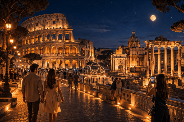 Nel 2026, Roma rinnova la propria offerta turistica puntando sul turismo notturno, offrendo unโ€™esperienza completamente diversa rispetto alle visite tradizionali. Con monumenti illuminati e percorsi esclusivi, la cittร  eterna si trasforma in uno scenario suggestivo e affascinante.
